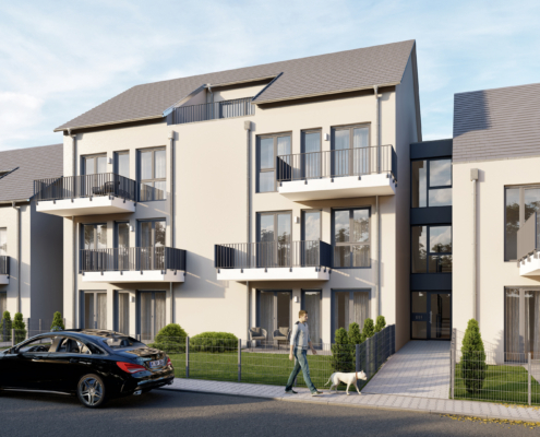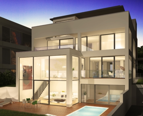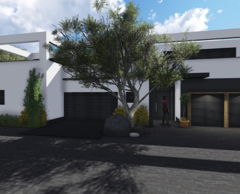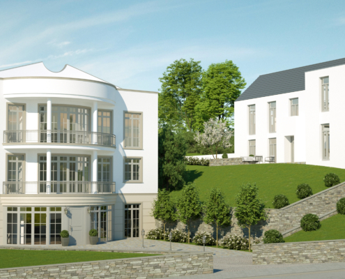 Im denkmalgeschützten Gesamtensemble nimmt der moderne Baukörper an der Straßenseite das Motiv und die Dimensionen der traufständigen Nachbargebäude auf. Die Wandflächen werden dabei durch einen Rahmen neu interpretiert. Bei der Umsetzung des Raumprogramms wurden innerhalb des Wohngebäudes konsequent getrennte Bereiche für Eltern und Kinder geschaffen, so daß eigenständige Zonen entstanden sind. Die Terrassierung des Baukörpers wird zum Spiegelbild der unterschiedlichen Ausrichtung der jeweiligen Nutzungseinheit.